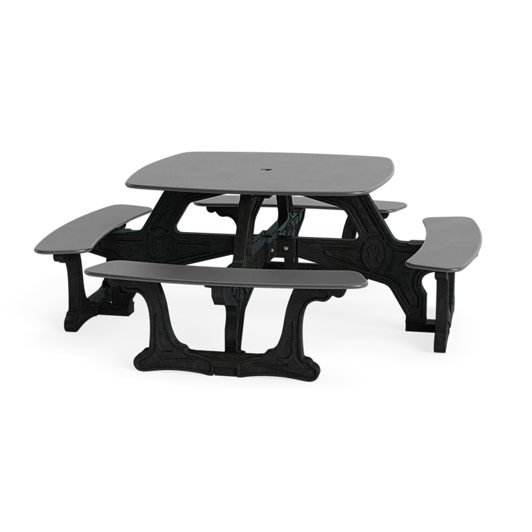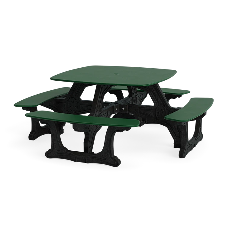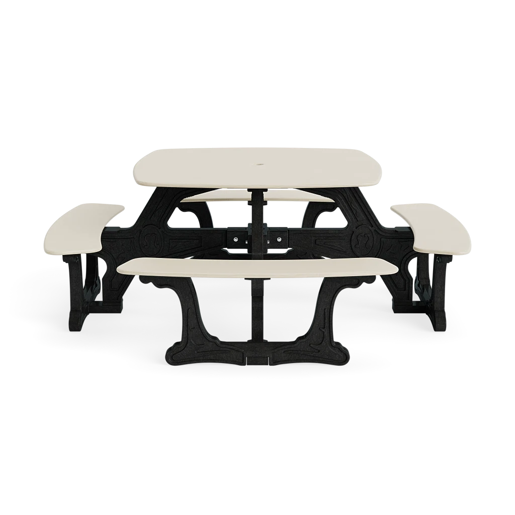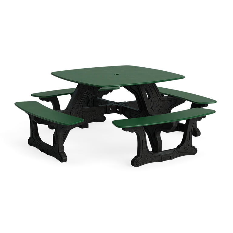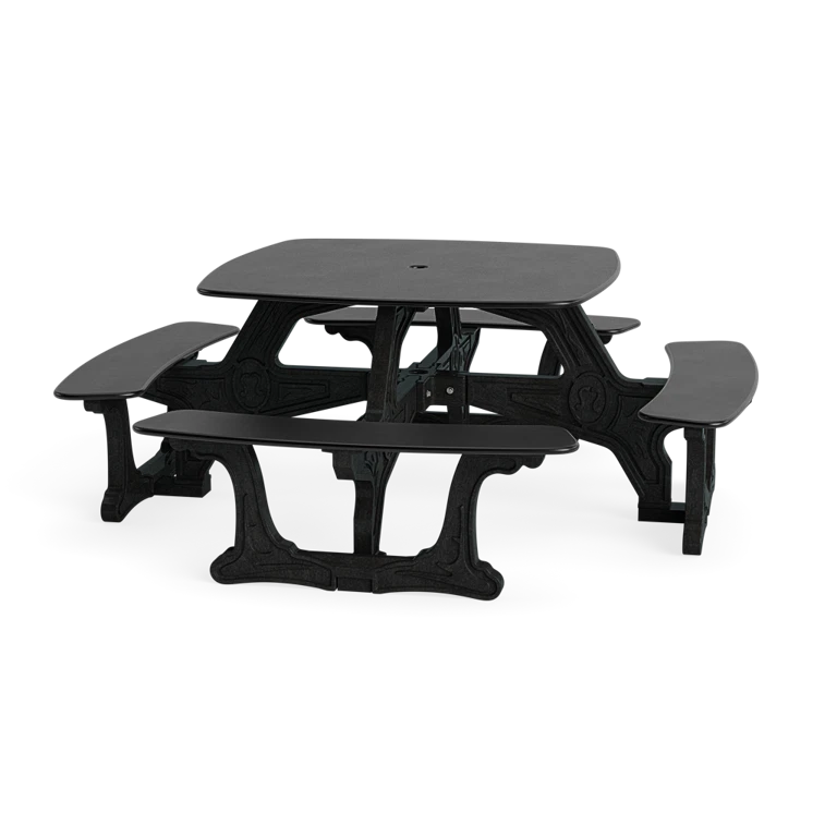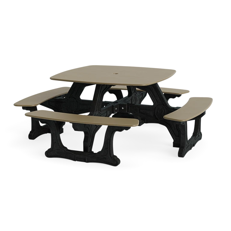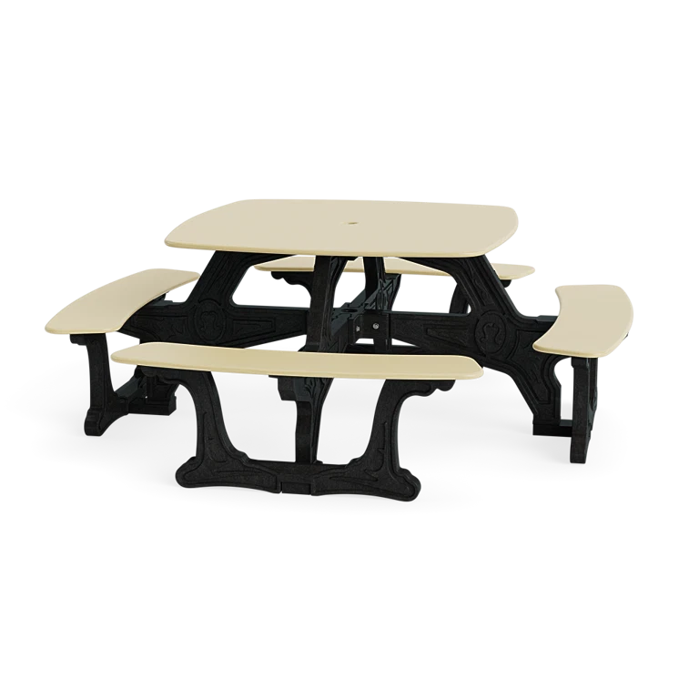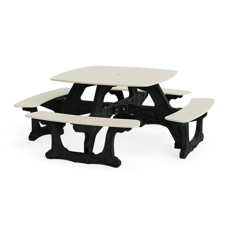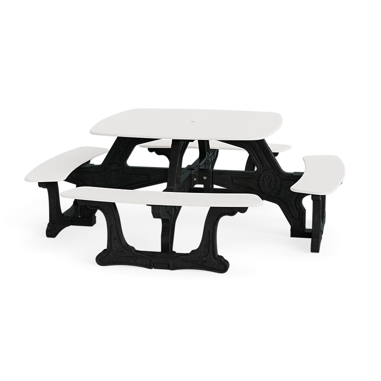 The Bistro Outdoor Table stands out due to its unique Green-Scapes frame. Although it mimics the look of cast iron, it is made from solid molded recycled plastic. This combination provides the classic aesthetic of metal, but without the corrosion, rust, or constant maintenance that typically come with traditional metal furniture.