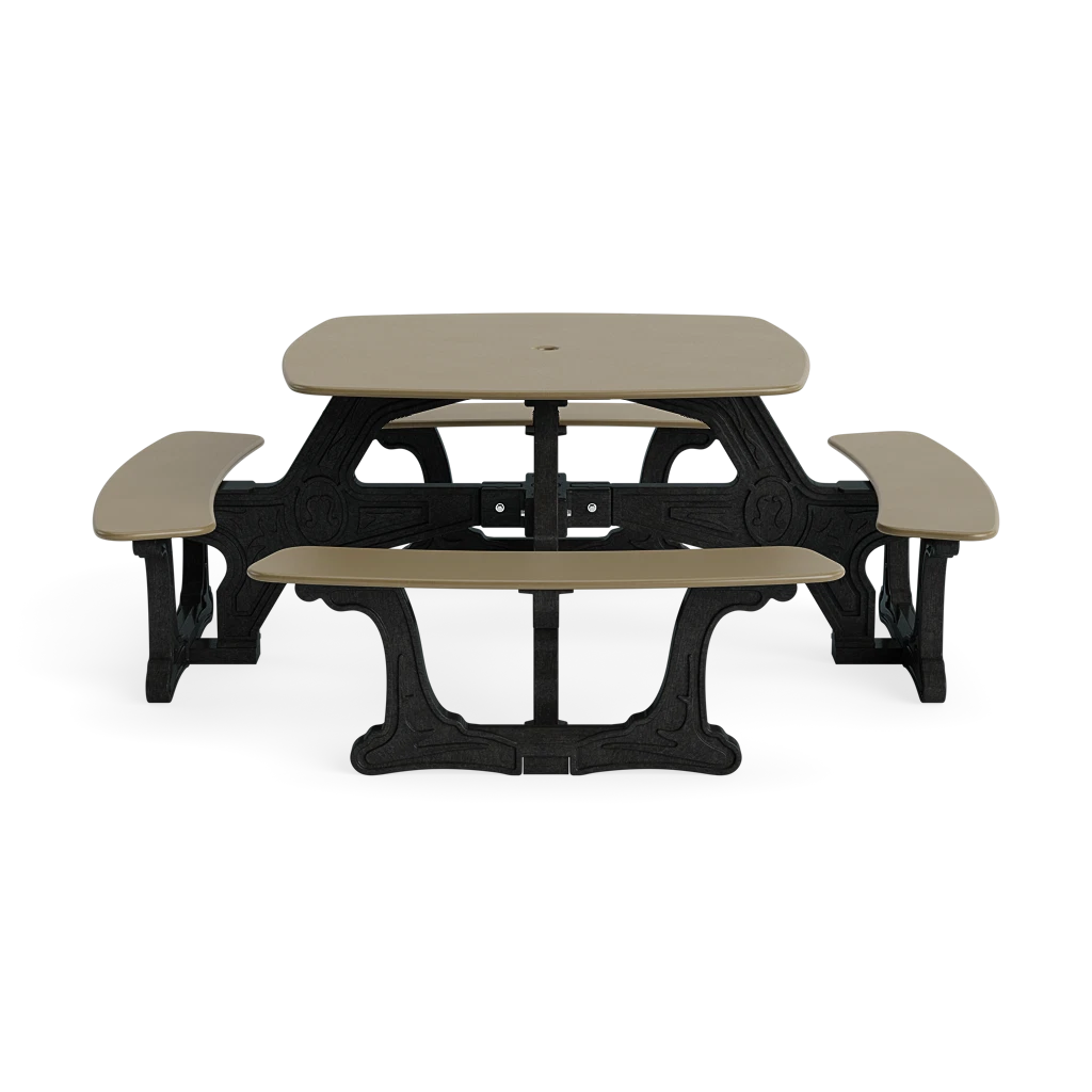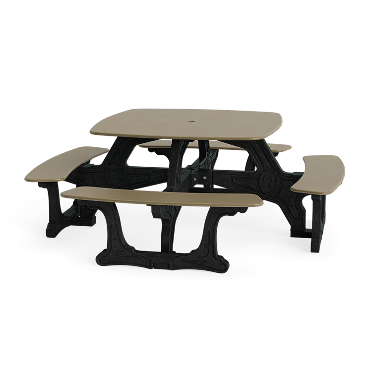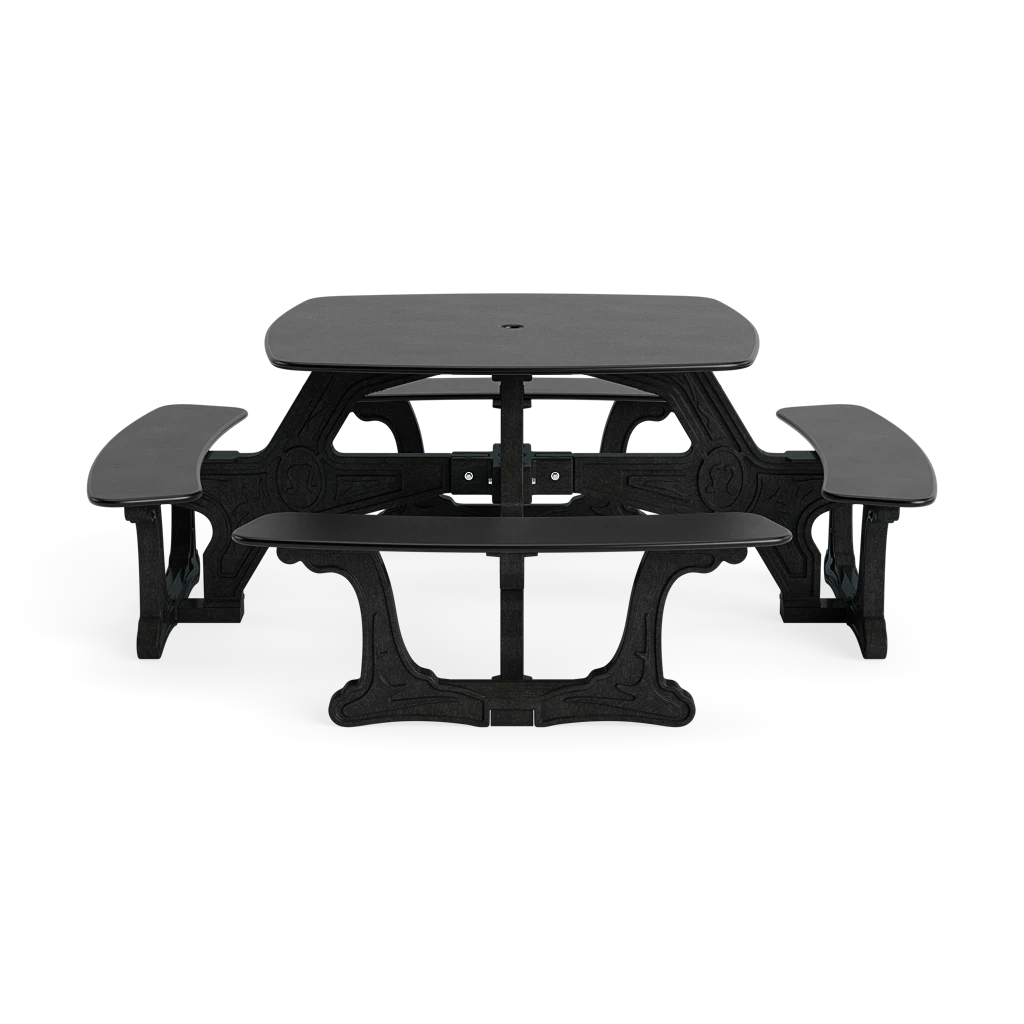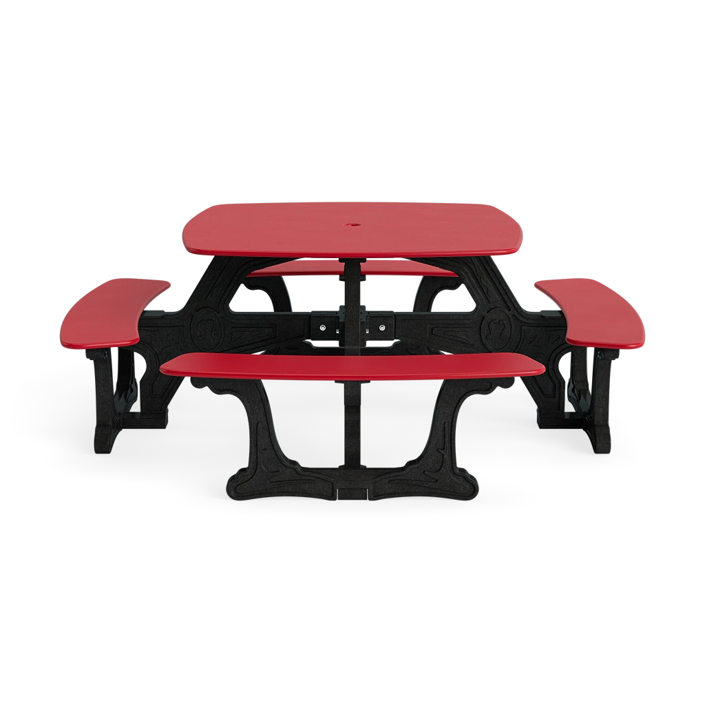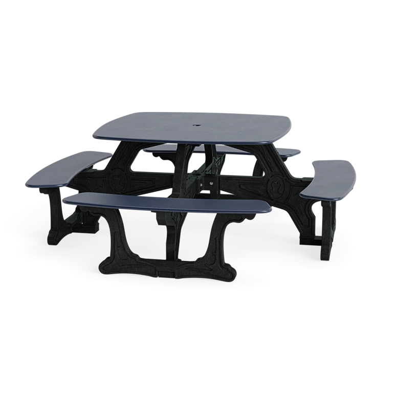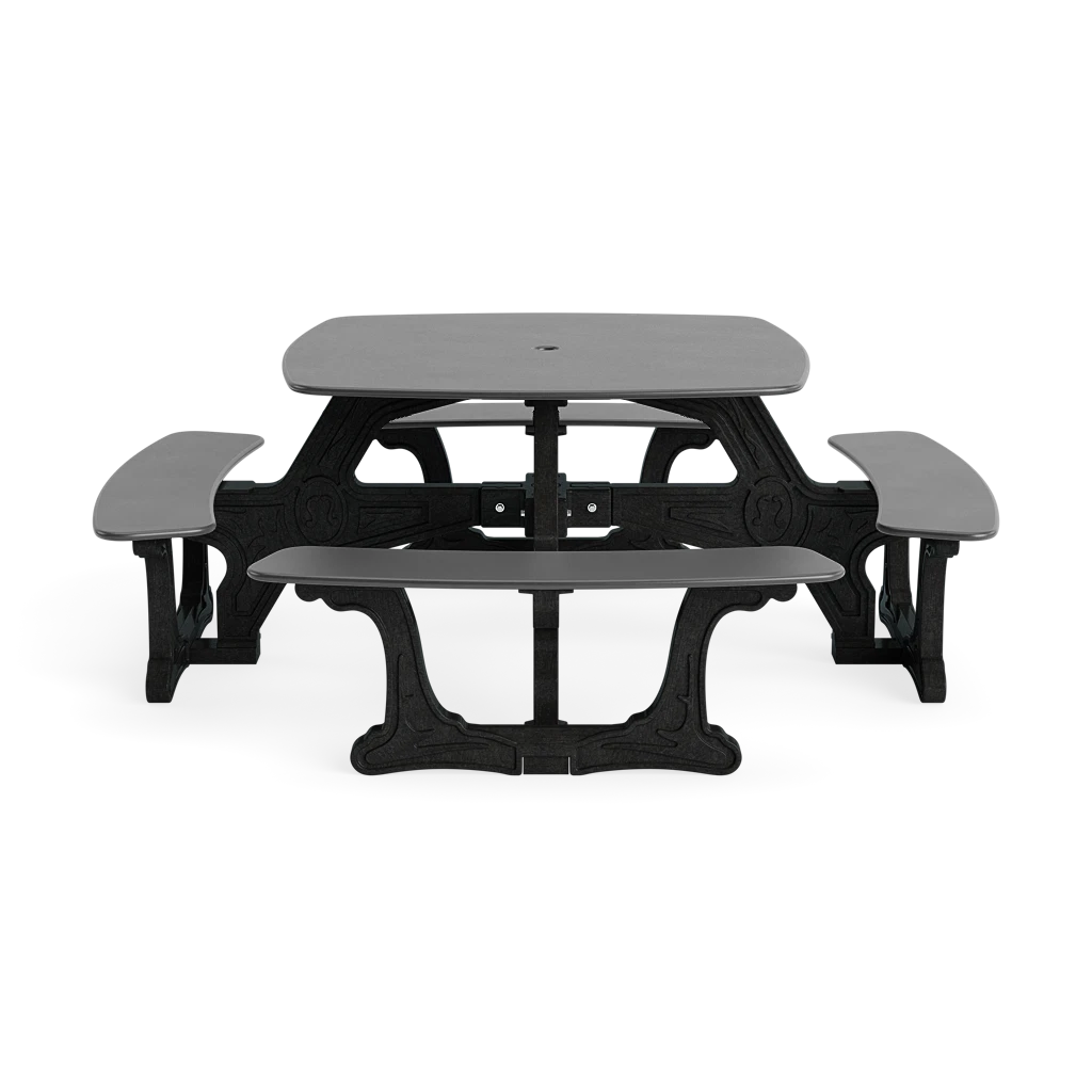 The Bistro Outdoor Table stands out due to its unique Green-Scapes frame. Although it mimics the look of cast iron, it is made from solid molded recycled plastic. This combination provides the classic aesthetic of metal, but without the corrosion, rust, or constant maintenance that typically come with traditional metal furniture.